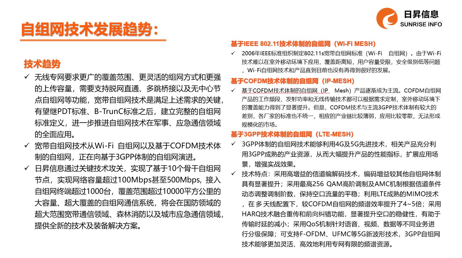 3GPP体制的自组网技术能够利用4G及5G先进技术,相关产品充分利用3GPP成熟的产业资源,从而大幅提升产品的性能指标,扩展应用场景,增强实战效果。