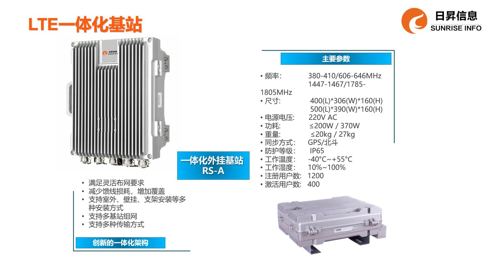 日昇信息LTE一体化室外基站是针对行业应用研制的室外型高性价比宽带无线接入产品。